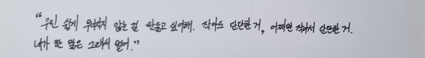그렇기에 가장 위로가 된 문장은 금융 협동조합에서 일하는 기현의 친구 새롬이 무심코 던진 기현의 내가 돈 낼게하는 말에 한 멀다는 대답이다. 그의 말처럼 평범한 것도 꿈꿀 수 없는 시대에는, 작지만 단단한 걸 만드는 것이야 말로 희망의 원천일 수 있을 것 같다.