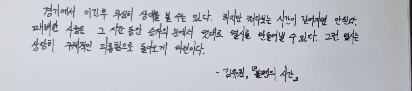 휴가 가기 전 날 홧김에주문한 <불펜의 시간>을 다 읽는데 채 하루가 걸리지 않았다. 책 뒤편에 써진 이 투박한 문구에 마음이 이끌렸다. 휴가에 돌아와서는 단숨에 읽었다. 평소에 소설 좋아하지도 않고, 야구를 좋아하지 않음에도 읽는 데 힘이 들지 않았다.