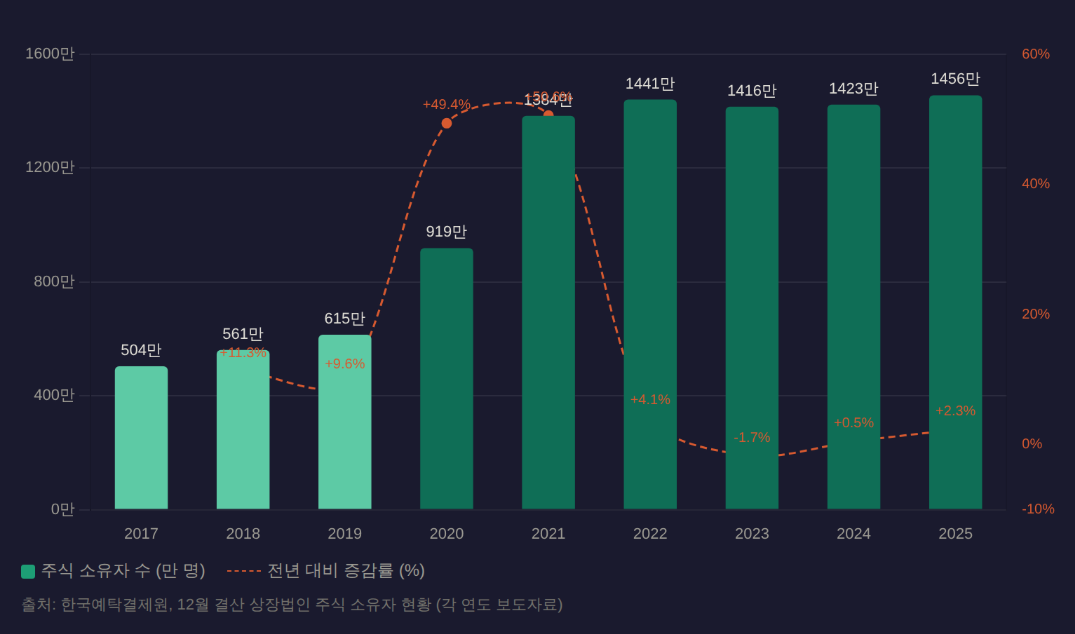 [15] 한국예탁결제원, 「12월 결산 상장법인 주식 소유자 현황」 각 연도: 2019년 약 615만 명 → 2020년 919만 명(전년 대비 약 300만 명 증가) → 2021년 1,384만 명(50.6% 증가) → 2022년 1,441만 명(정점) → 2023년 1,416만 명(소폭 감소) → 2024년 1,423만 명(0.5% 증가, 개인 1,410만 명, 99.1%). 2025년 12월 결산 기준 1,456만 명으로 역대 최고(시사저널 2026.3.18. 보도). 분산투자 비율 변화(6종목 이상 보유 비율: 2010년대 초 13% → 2021년 29.1%, 1-3종목 집중투자: 75% → 56.7%)는 한국예탁결제원 보도자료를 분석한 lovefund이성수(Investing.com, 2025.3.18.) 참조.