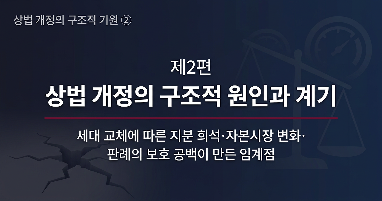 이번 글에서는 그 연혁적 맥락 위에서, 2025~2026년 상법 개정을 촉발한 구조적 조건들을 분석한다. 정치적 계기가 있었음은 부인할 수 없으나, 그 계기가 작동할 수 있었던 것은 한국 자본주의의 내부에서 기업 지배구조의 모순이 더 이상 봉합할 수 없는 수준에 도달하였기 때문이다. 지배주주의 지분 희석과 우회적 지배구조의 심화, 자본시장 참여자의 질적 변화, 소액주주 운동의 제도적 성숙, 그리고 대법원 판례가 드러내 온 보호 공백이라는 네 가지 구조적 조건이 임계점을 통과한 결과로 보아, 본 글에서는 이를 순서대로 살펴본 뒤, 거시경제 불안이라는 추가 요인과 함께, 이번 개정의 의미·남아 있는 과제·예상되는 리스크를 전망한다.