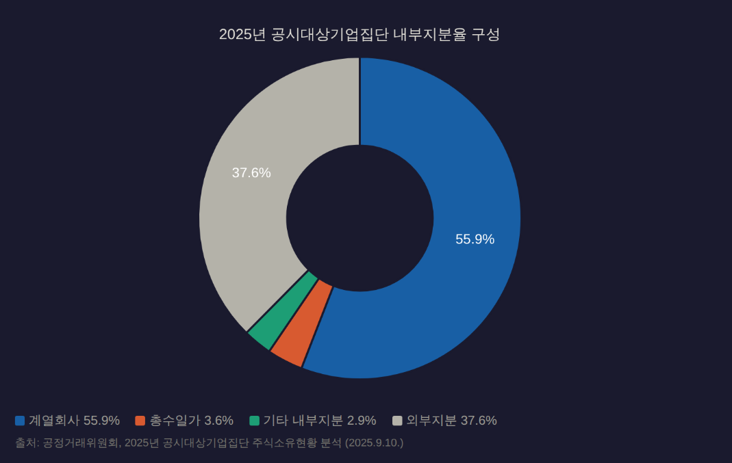[1] 공정거래위원회, 「2025년 공시대상기업집단 주식소유현황 분석·공개」 (2025.9.10.): 총수 있는 81개 집단(소속회사 3,090개사) 내부지분율 62.4%. 총수일가 지분율은 최근 5년간 3.5~3.7% 수준 유지, 계열회사 지분율 2021년 51.7% → 2025년 55.9%.
