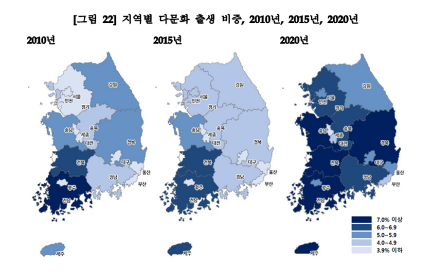 기대수명 증가가 출산율을 보상하는 측면도 있지만, 2020년에 한국의 인구가 처음 감소했다는 것은 시사하는 바가 크다. 출산율은 진작에 낮았지만 기대수명 증가로 해결되지 않는 잔여를 채웠던 건 이민자들이었다. 낮은 출산율이 더 낮아지지 않았던 건 사실 이민자들 덕분일지도 모른다. 다문화 가정 관련 통계를 살펴보면, 다문화 가정의 출생아 수도 점점 줄고는 있지만, 전체 출생아 중 그 비율(2020년 기준 6.0%)은 나날이 높아져가고 있다.